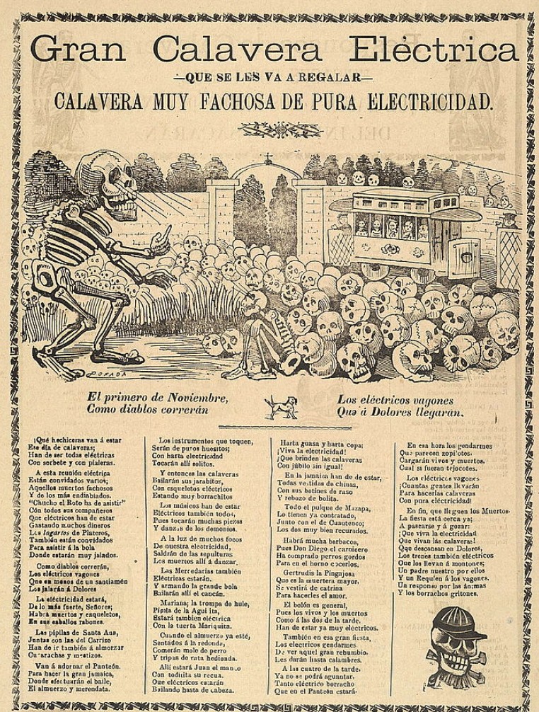 The prints of José Guadalupe Posada (1852–1913) remain among the most iconic and influential examples of how popular culture became a vehicle for political and social critique in late 19th- and early 20th-century Mexico. Through his distinctive engravings and illustrations—widely circulated in broadsheets, pamphlets, and newspapers—Posada gave visual expression to the frustrations and hopes of Mexico’s working class, who bore the weight of Porfirio Díaz’s authoritarian modernization. His art offered not just entertainment, but sharp satire, often skewering the excesses of the bourgeoisie and exposing the deep injustices of Díaz’s regime. Posada’s images struck a chord with the public, weaving together acerbic commentary with elements of folk tradition, religious symbolism, and the vivid iconography of Day of the Dead calaveras—motifs he helped bring into popular consciousness. Though he died in poverty and relative obscurity, Posada’s influence far outlived him. He is now hailed as the “printmaker of the Mexican people,” a tribute to his deep connection with the humor, struggles, and resilience of everyday Mexicans. His prints not only captured a turbulent era in Mexican history but also paved the way for future generations of politically engaged artists—including the Mexican Muralists, such as Diego Rivera, who saw Posada as a foundational figure in the evolution of modern Mexican art. Consider the following questions as your read the selections below: