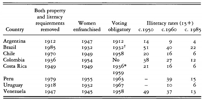 Despite the elitist nature of these regimes, many Latin American countries experienced notable expansions of suffrage and political participation, particularly during the period from 1930 to 1990. This era saw significant reforms that broadened the electorate, granting voting rights to previously excluded groups, including women and the lower socioeconomic classes.