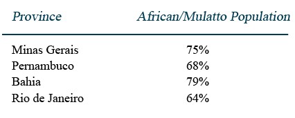 The presence of African slaves and their descendants has been highlighted by historians through quantitative analysis of social and economic records. The data has shown the following for the four largest provinces in colonial Brazil:
