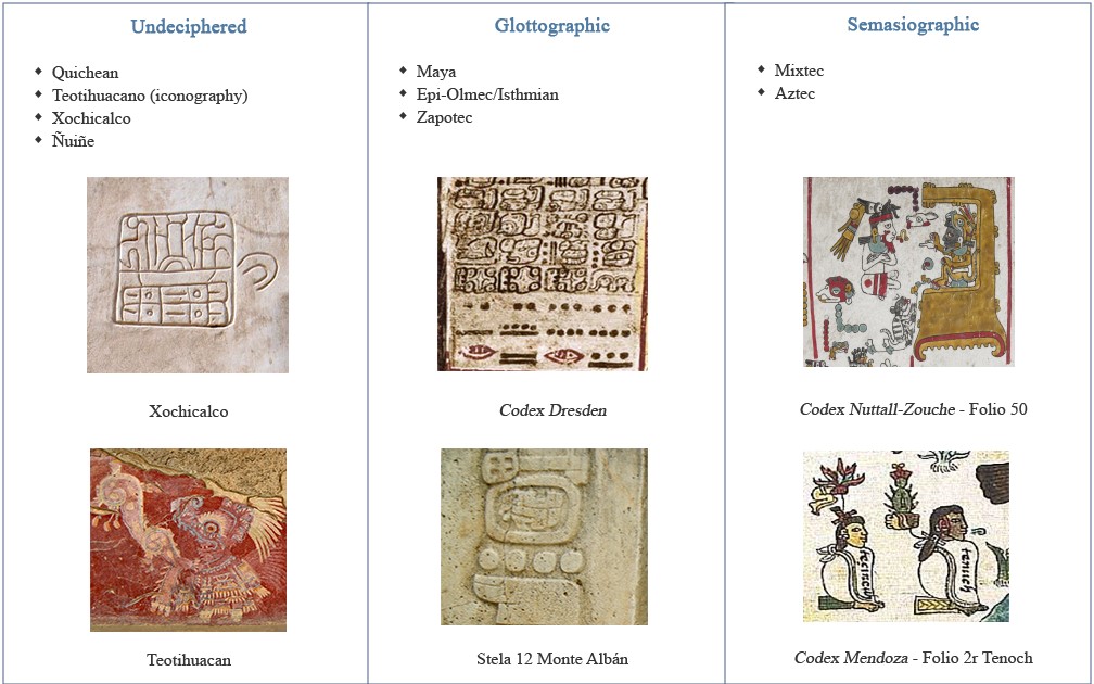 Mesoamerican cultures also developed advanced traditions of writing, with five surviving writing systems either fully or partially deciphered by scholars: the Zapotec, Epi-Olmec/Isthmian, Mixtec, Maya, and Nahua. Pre-Columbian Mesoamerican writing systems utilized both glottographic and semasiographic methods. Glottographic systems, such as those of the Epi-Olmec/Isthmian, Zapotec, and Maya, linked visual symbols to sounds or words. In contrast, semasiographic systems like the Mixtec and Nahua used non-phonetic visual marks to convey ideas or concepts. Of these, the Maya script was the most sophisticated, employing “a combination of logograms representing whole words, phonetic signs, and semantic qualifiers, which together reproduce a verbal text.”
