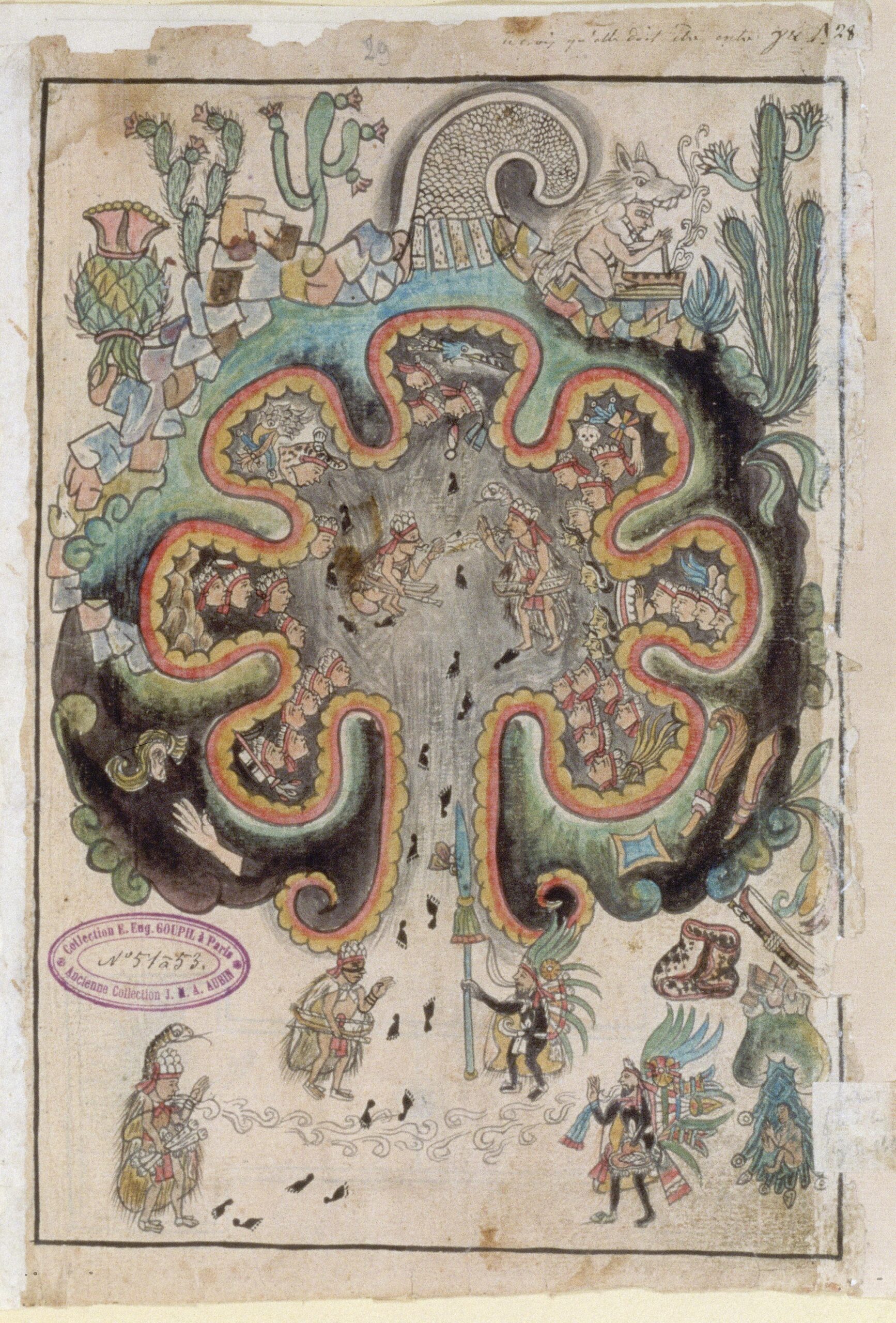 Scholars generally agree that the first of the “Atzlan Migrants” reached central Mexico around 1200 C.E., or perhaps earlier. Over time, a shared Nahua culture emerged in the region. According to sources, the god Huitzilopochtli guided the Mexica migration through various territories. The Annals of Cuauhtitlan (c. 1570), preserved in the Codex Chimalpopoca, is one such source that documents these migrations.