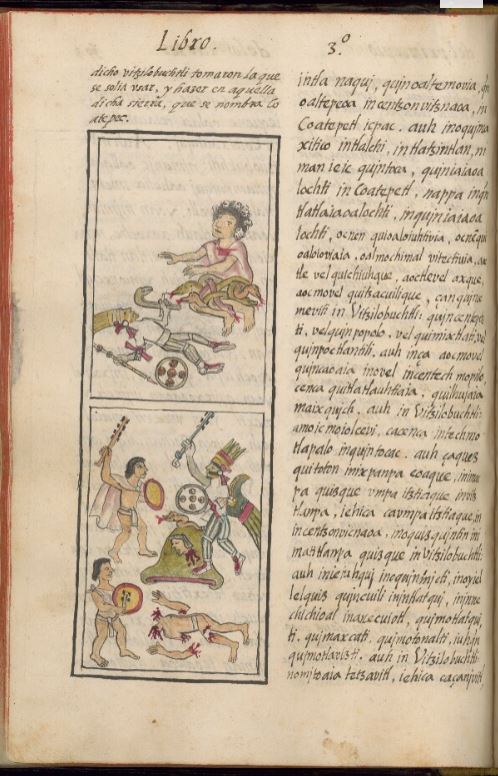 | “Then Huitzilopochtli was proud, he pursued the four hundred gods of the south, he chased them, drove them off the top of Coatepetl, the mountain of the snake. And when he followed them down to the foot of the mountain, he pursued them, he chased them like rabbits, all around the mountain. He made them run around it four times. In vain they tried to rally against him, in vain they turned to attack him, rattling their bells and clashing their shields. Nothing could they do, nothing could they gain, with nothing could they defend themselves. Huitzilopochtli chased them, he drove them away, he humbled them, he destroyed them, he annihilated them.” – – Codex Chimalpopoca |