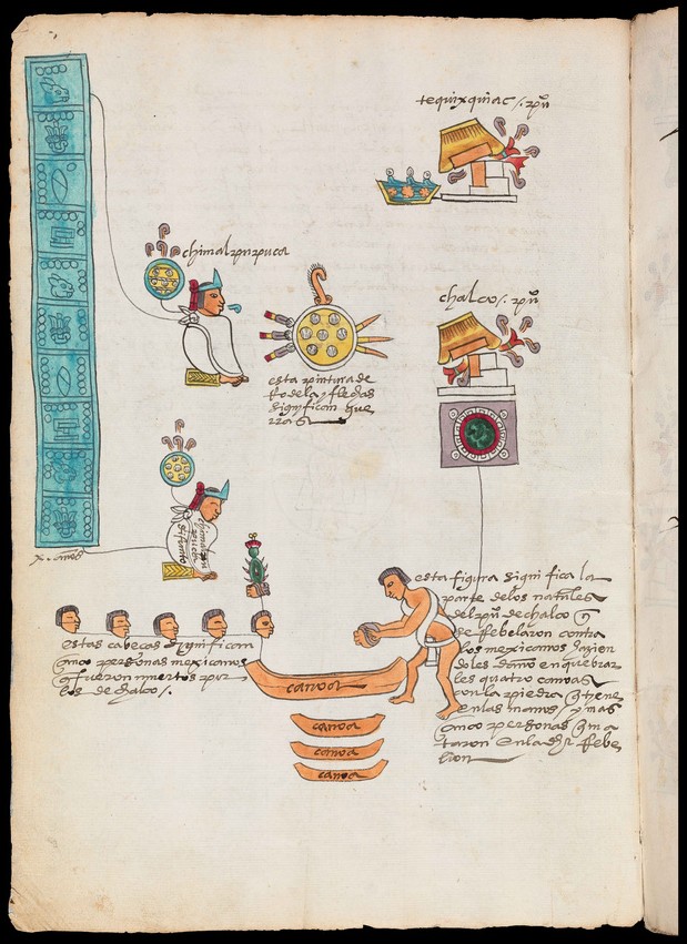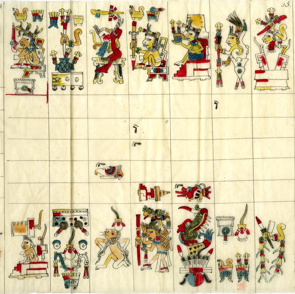 In constructing these interpretations of ritual human sacrifice, historians and anthropologists have used a variety of sources. These include pre-conquest (before the arrival of Europeans) and colonial (after the arrival of Europeans) indigenous sources. Many scholars conclude form examining these sources that sacrifice by beheading was a ritual practiced regularly by the Nahua. Why? These scholars explain that the Nahua believed that the head collected a divine force called tonalli. This has led many scholars to argue that “the decapitated head of enemy warriors were a supreme prize for the city [ Tenochtitlan ].” The Codex Borgia is believed by specialists to have been written shortly after the arrival of the Spanish and is a source regularly referred to for evidence of the practice of ritual human beheading. Above is a fragment from the 260-day ritual calendar recorded in the Codex Borgia used by scholars to support their interpretations about ritual human beheading.
