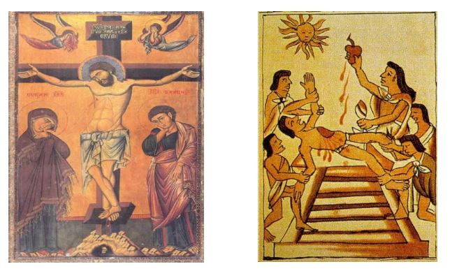 Another interpretation of ritual human sacrifice is proposed by Peter Hassler, an ethnologist at the University of Zurich. I should note that like Harner’s view, Hassler’s is also what one would consider fringe interpretations with little if any support. However, they are still worth exploring. Hassler’s critique of “mainstream” views of ritual human sacrifice was published in Die Zeit, an article you will read. How has Hassler challenged the “mainstream” interpretation of ritual human sacrifice? Hassler believes “There are plenty of possible interpretations of the images of hearts and even killings . . . “ One is that these images “could present narrative images–allegories, symbols, and metaphors.” Let us briefly test this possibility by exploring the Eucharist performed in Christian masses. How might a non-Christian who does not fully understand the ceremony of the Eucharist perceive what takes place from reading the statements below?
