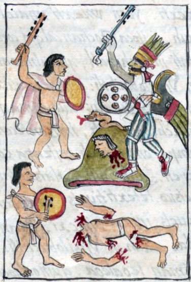| “Thus was performed the sacrificial slaying of men, when captives and slaves died, who were called Those who have died for the god. Thus they took [the captive] up [to the pyramid temple] before the devil. [the priests] going holding him by his hands. And he who was known as the arranger [of captives], this one laid him out upon the sacrificial stone. And when he had laid him upon it, four men stretched him out, [grasping] his arms and legs. And already in the hand of the fire priest lay the [sacrificial] knife, with which he was to slash open the breast of the ceremonially bathed [captive].” – Florentine Codex |